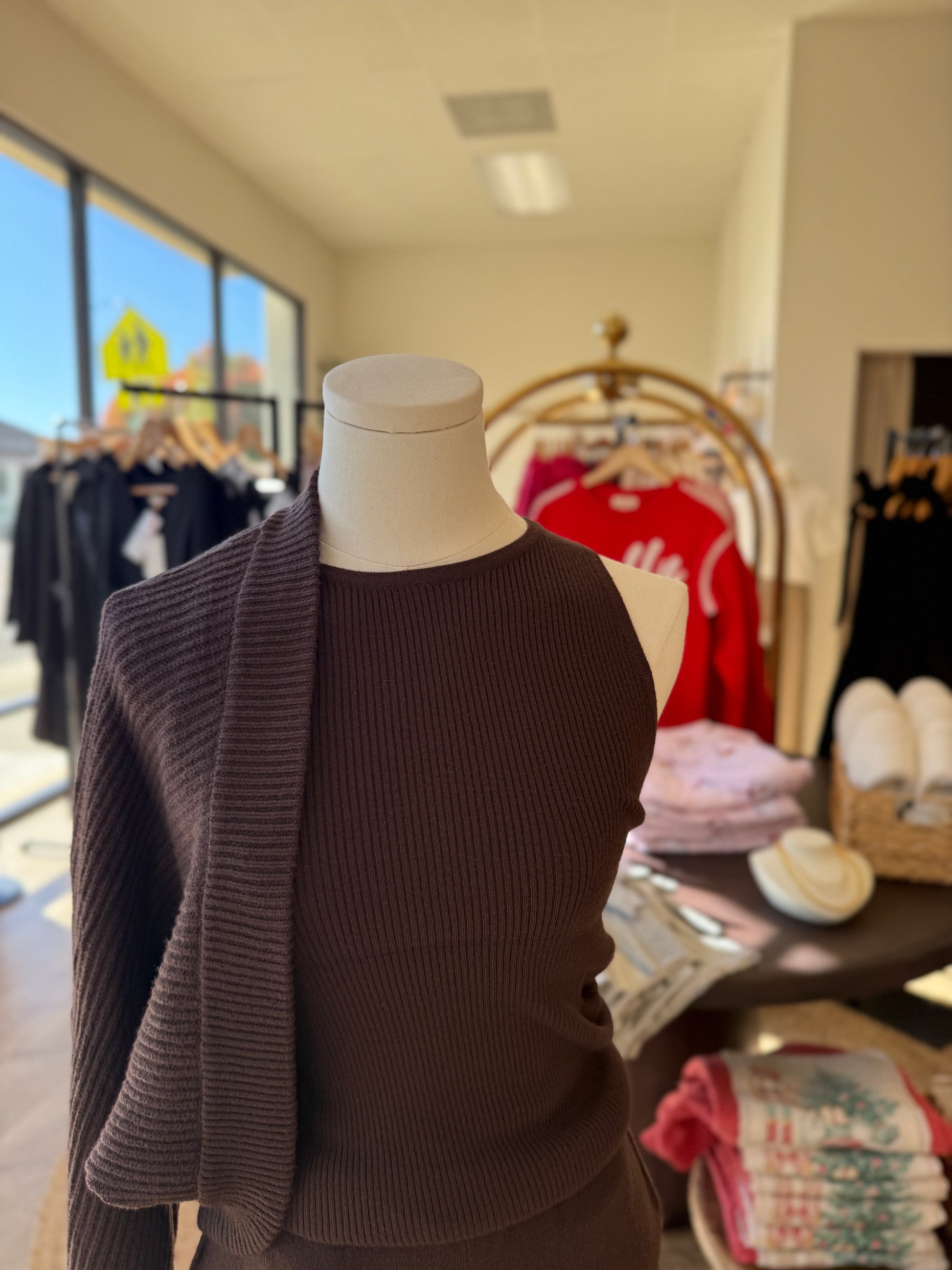 The outfit is a rich chocolate brown ribbed knit ensemble featuring: