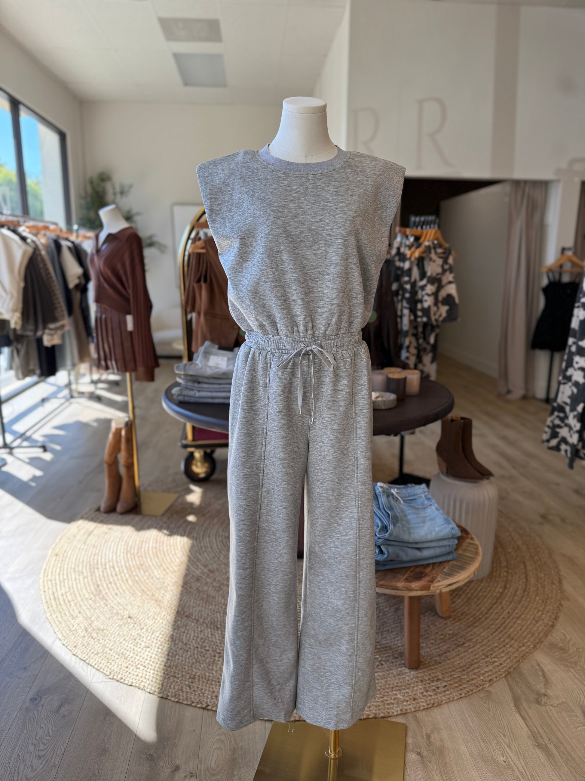 Elevated loungewear meets effortless style. The Drew Knit Jumpsuit in heather gray is crafted from a soft, breathable knit that feels as good as it looks. Featuring strong padded shoulders for a structured, modern silhouette, an adjustable drawstring waist for the perfect fit, and wide-leg pants that move with ease—this one-piece wonder takes you from lounging at home to casual errands in an instant. Pair it with sneakers for a laid-back vibe, or dress it up with a leather jacket and boots for an off-duty chic look.