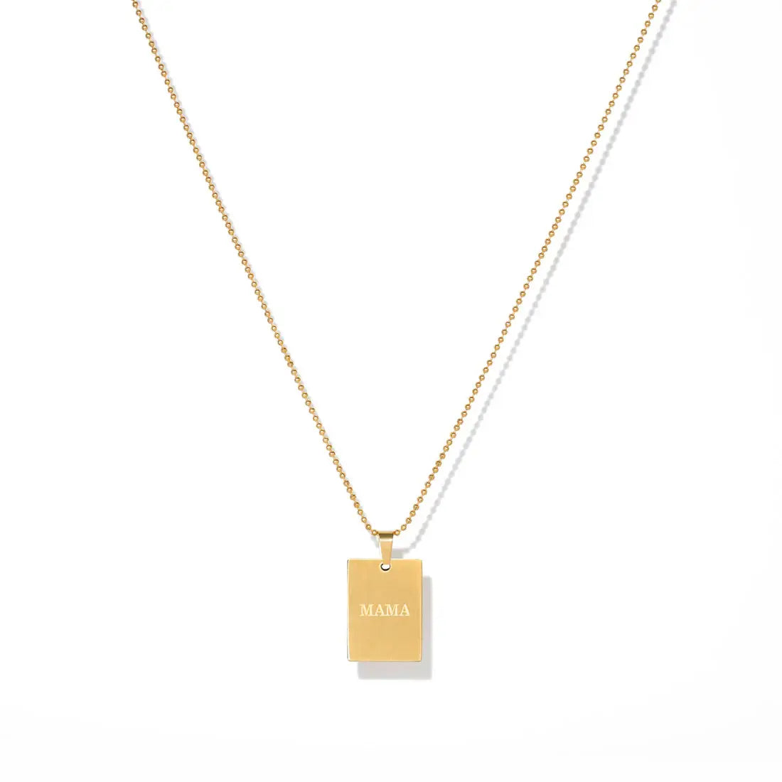 Waterproof, Stainless Steel - Waterproof. 18k gold, Hypoallergenic, Nickel free Size: 18"+3" extender, pendant 14mm x 19mm. Closure: lobster clasp Designer note: this mama necklace is made for the moms that stay up with the trends and love a modern look!